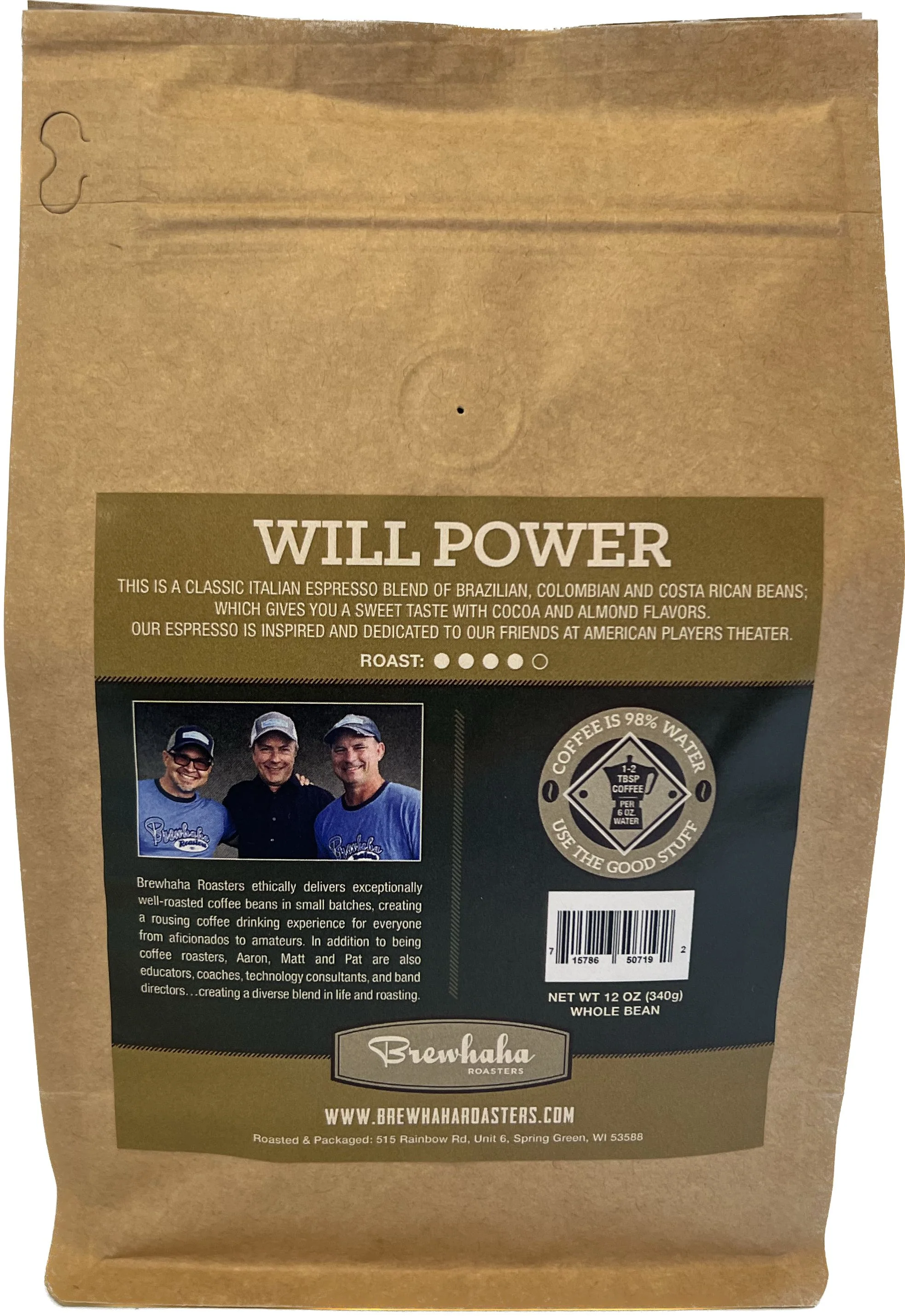 This is a classic Italian espresso blend of Brazilian, Colombian and Costa Rican beans; which gives us a sweet taste with cocoa and almond flavors. Our espresso is inspired and dedicated to our friends at American Players Theater.